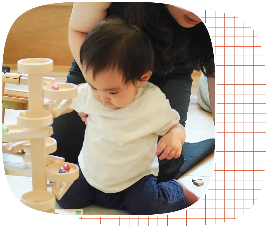 おもちゃに夢中なこどもを、保育士と一緒に、